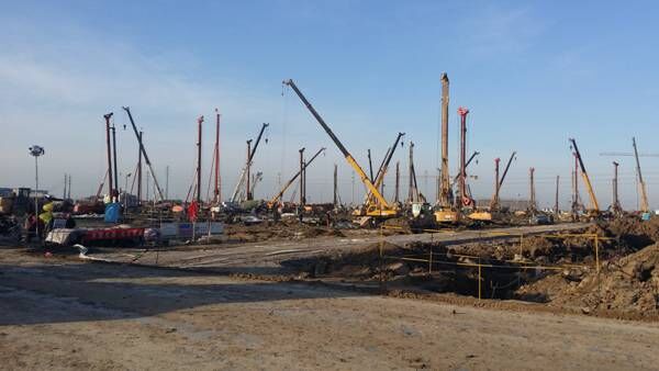 本工程主要特點(diǎn)為“短、平、快”。工期緊,任務(wù)重,施工場地狹小,投入機(jī)械設(shè)備和人員眾多。高峰期投入旋挖鉆機(jī)40臺(tái)、潛水鉆6臺(tái)、鏟車42臺(tái)、挖掘機(jī)7臺(tái)、吊車44臺(tái)、HZS120型攪拌站一套、35型攪拌站一套、90攪拌站一臺(tái)套、罐車31臺(tái),項(xiàng)目施工的人員達(dá)918人。由于地層條件復(fù)雜,場地地層較軟,現(xiàn)場采用灰土拌合硬化,部分區(qū)域鋪設(shè)鋼板配合施工,有效的解決了場地困難問題,通過精心組織,保證了工程優(yōu)質(zhì)高效實(shí)施。