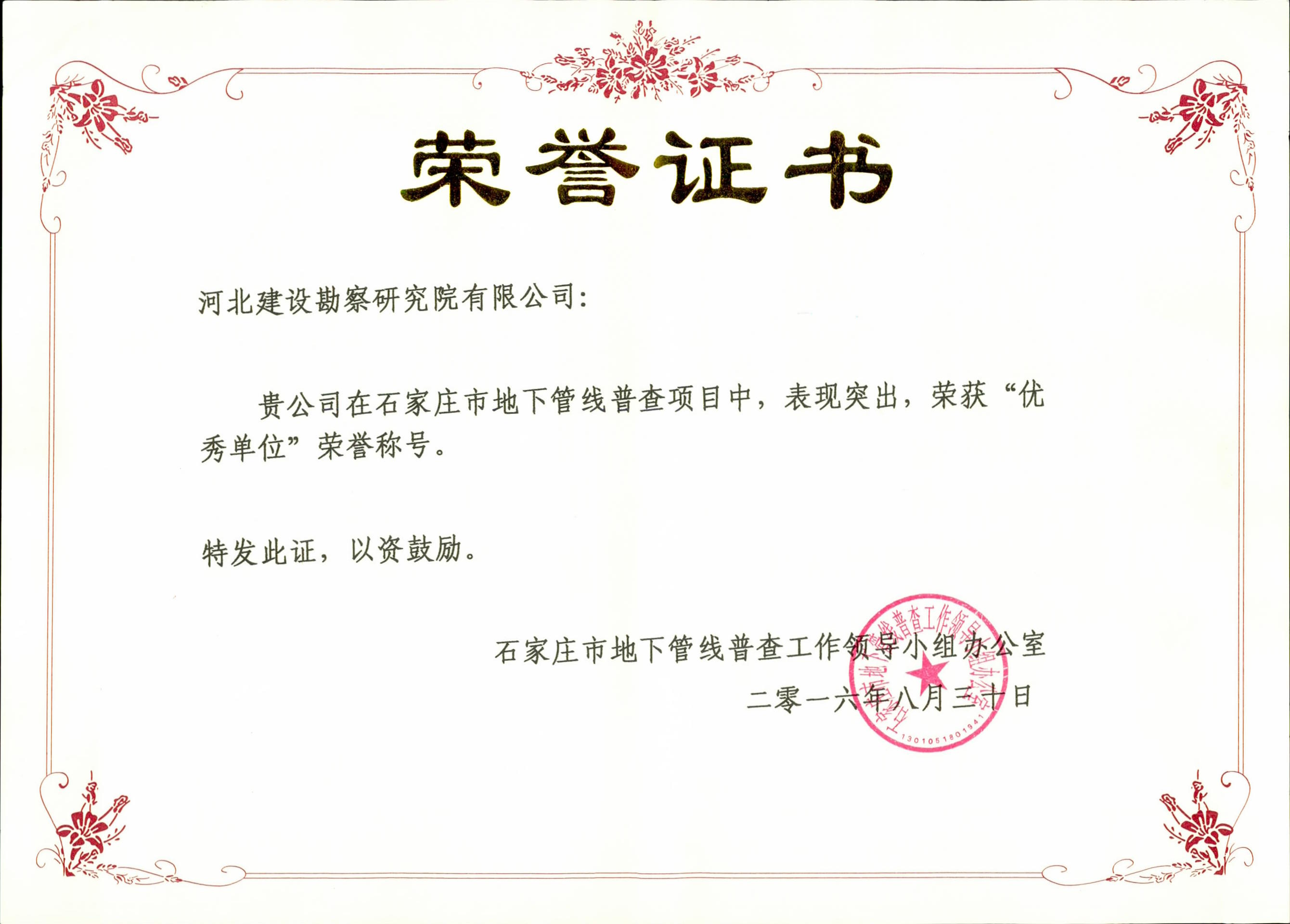 公司承擔(dān)的石家莊市地下管線普查項(xiàng)目于近日完工,并順利通過(guò)石家莊市地下管線普查工作領(lǐng)導(dǎo)小組檢查。石家莊市地下管線普查工作領(lǐng)導(dǎo)小組充分肯定了我公司在該項(xiàng)目中取得的成績(jī)和突出的表現(xiàn),特頒發(fā)“優(yōu)秀單位”榮譽(yù)證書(shū),以資鼓勵(lì)。