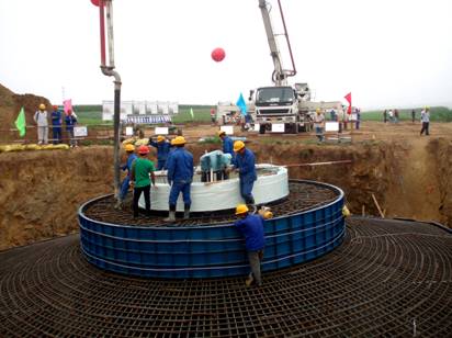 我公司承擔了該風電場的土建工程及接地,施工內容主要包括風電機組基礎33座、變壓器基礎33座,共完成土石方開挖與回填40112m3,完成混凝土12578m³。