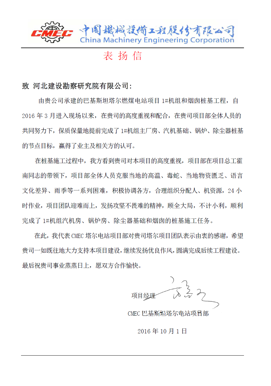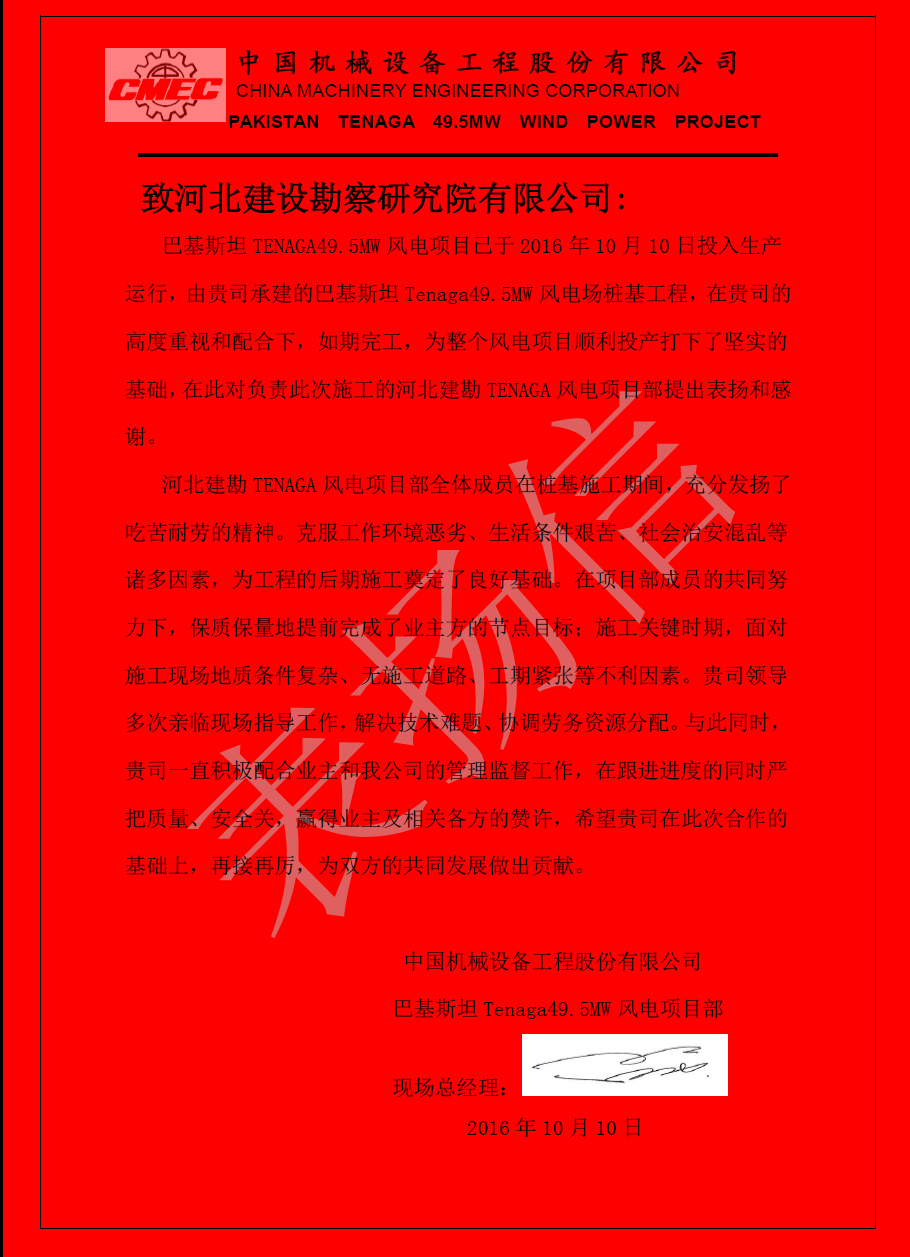 由我公司承建的巴基斯坦塔爾燃煤電站項目1#機組和煙囪樁基工程和巴基斯坦Tenaga49.5MW風電項目,項目部全體人員在項目總工霍南的帶領下,克服工作環(huán)境惡劣、生活條件艱苦等一系列困難,積極協(xié)調(diào)各方,合理組織分配資源,順利完成階段施工任務。近日,總包方中國機械設備工程股份有限公司(CMEC)向我公司發(fā)來感謝信,對我公司兩個項目部團隊表示由衷的感謝,并希望我們繼續(xù)發(fā)揚優(yōu)良作風,圓滿完成后續(xù)工程建設。