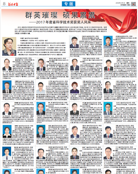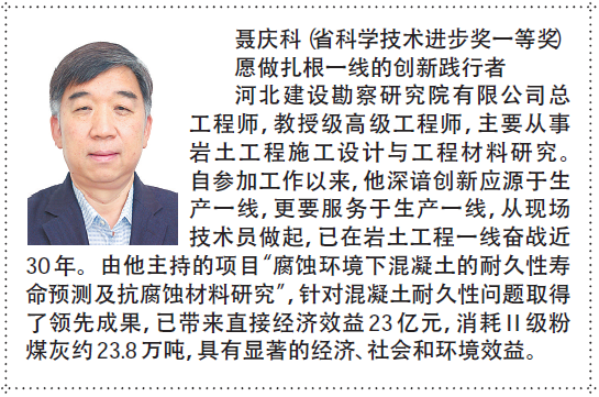 6月5日,河北日報專版文章《群英薈萃 碩果累累》對2017年度河北省科學(xué)技術(shù)獎獲獎人風(fēng)采進行展示。我公司的完成的《腐蝕環(huán)境下混凝土的耐久性壽命預(yù)測及抗腐蝕材料研究》獲得一等獎,聶慶科總工程師作為第一完成人在專版文章中進行了刊載,這是以聶總為代表的廣大專業(yè)技術(shù)人員的共同光榮,也必將激勵我們更加努力爭創(chuàng)新的科技成果和榮譽。