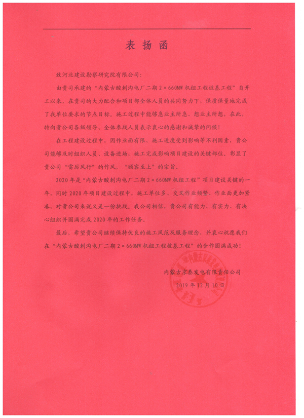 近日,由我公司承建的內(nèi)蒙古酸刺溝二期2×660WM機(jī)組工程樁基工程收到甲方內(nèi)蒙古京泰發(fā)電有限公司的表揚信,對項目部全體員工的辛勤付出,給予了高度認(rèn)可和評價,并為后續(xù)雙方的合作奠定了良好基礎(chǔ)。這充分彰顯了河北建勘人“雷厲風(fēng)行”的作風(fēng),“顧客至上”的宗旨。我們將繼續(xù)保持我們的施工風(fēng)范和服務(wù)理念,再接再厲,圓滿完成后續(xù)施工任務(wù)!
