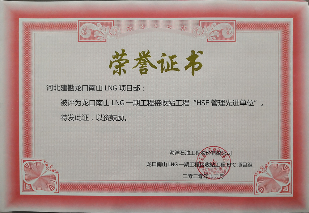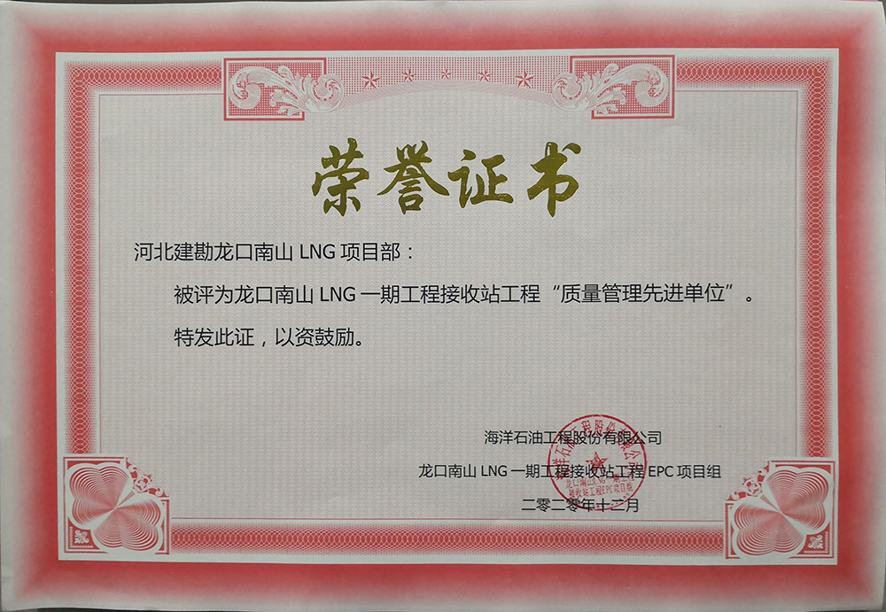 2020年12月,公司收到海洋石油工程股份有限公司發(fā)來的表揚(yáng)信,對(duì)我公司在龍口南山LNG一期工程接收站工程EPC項(xiàng)目儲(chǔ)罐樁基工程標(biāo)段一施工過程中,面對(duì)施工現(xiàn)場(chǎng)地質(zhì)情況復(fù)雜、新工藝、施工難度大、氣候炎熱多雨、新冠疫情、人材機(jī)緊缺等不利因素,按合同要求順利完成了一標(biāo)段1#和2#儲(chǔ)罐3497根振沖碎石樁和720根樁柱一體化灌注樁全部施工任務(wù),給予了高度認(rèn)可和好評(píng),并表示感謝!我公司被評(píng)為“質(zhì)量管理先進(jìn)單位”和“HSE管理先進(jìn)單位”并頒發(fā)了榮譽(yù)證書,同時(shí)對(duì)先進(jìn)個(gè)人頒發(fā)了“優(yōu)秀項(xiàng)目管理者”、 “HSE管理先進(jìn)個(gè)人”、 “質(zhì)量管理先進(jìn)個(gè)人”榮譽(yù)證書。