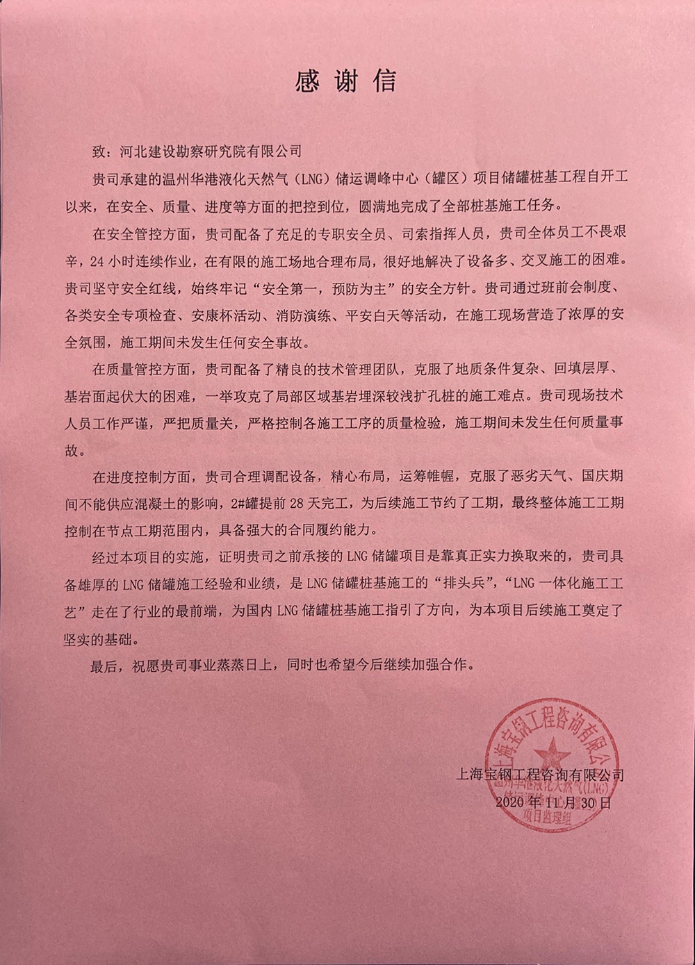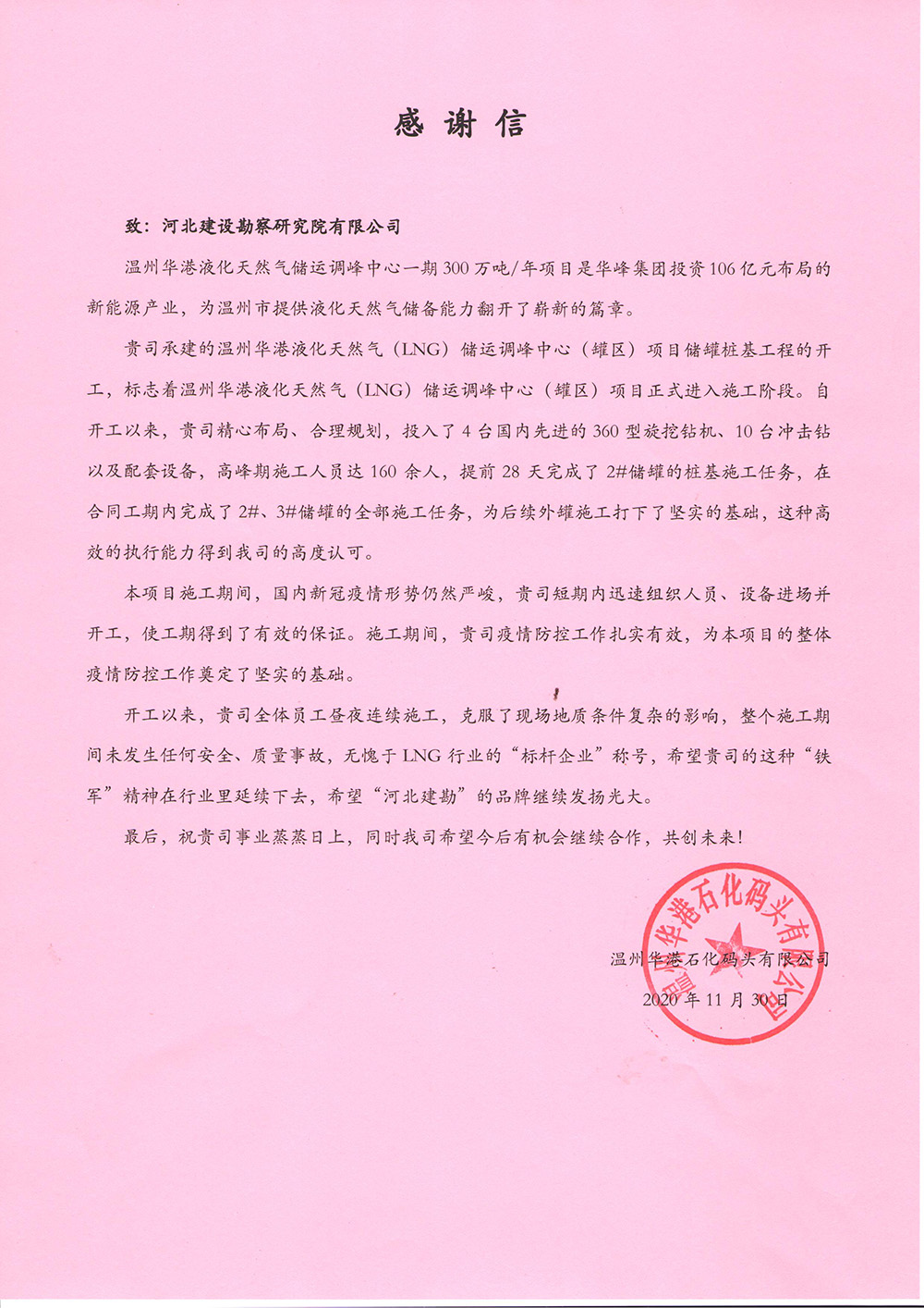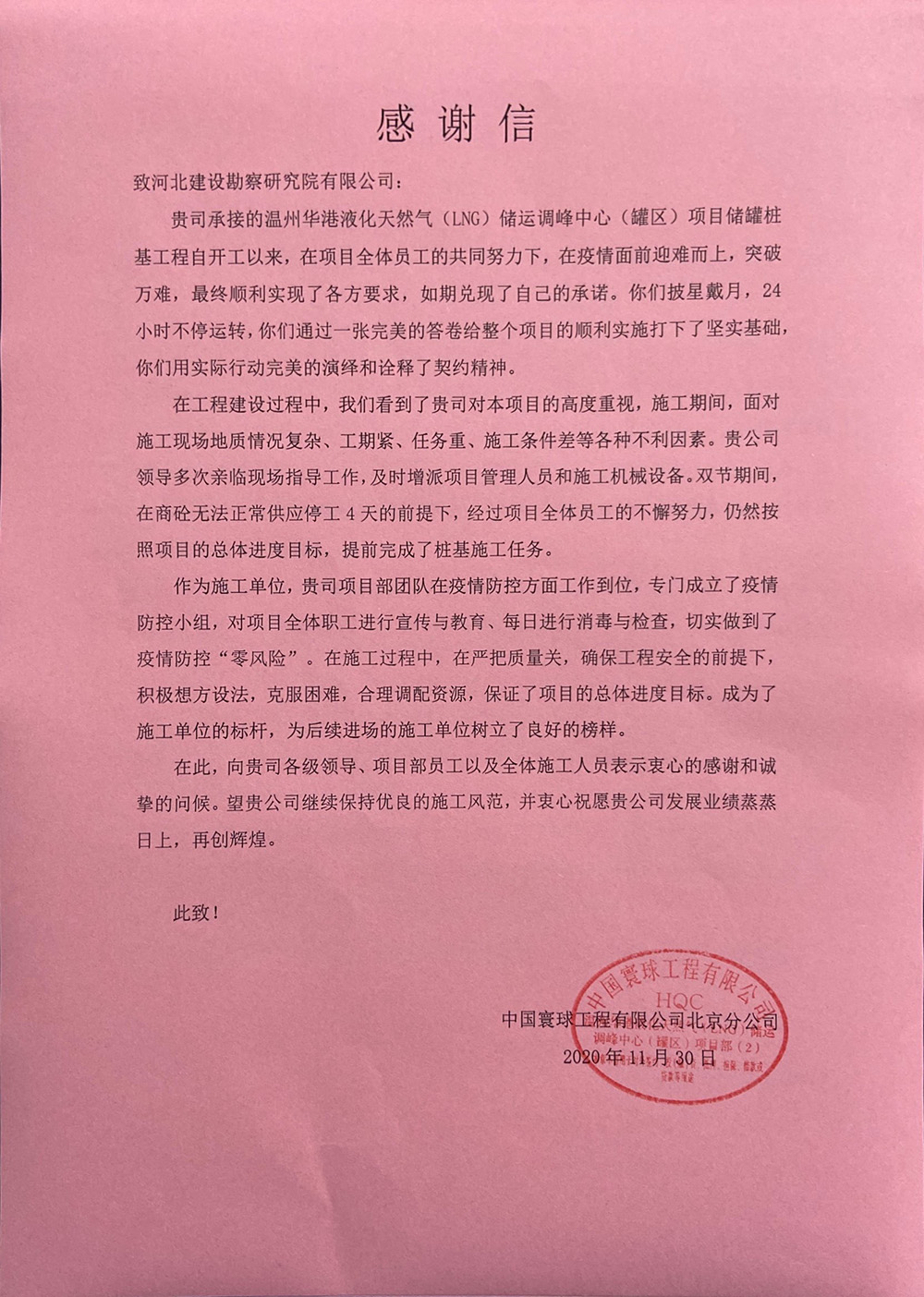 溫州華港LNG項目自2020年8月19日開工以來,面對地質(zhì)情況復雜、工期緊、任務重、施工條件差等諸多不利因素,項目部精心部署工作,科學組織生產(chǎn),全體員工大力發(fā)揚“不怕累、不怕苦、全力打造精品工程”的精神,在嚴格落實疫情防控措施的同時,嚴把進度關(guān)、質(zhì)量關(guān)、安全關(guān),確保制定的施工計劃有序推進,最終高標準完成項目施工,兌現(xiàn)了公司的承諾,為溫州華港LNG工程的竣工投產(chǎn)奠定了堅實的基礎(chǔ)。為此,業(yè)主、總包、監(jiān)理紛紛發(fā)來表揚信,對我項目部提出表揚,并衷心祝愿我公司發(fā)展業(yè)績蒸蒸日上,再創(chuàng)輝煌。