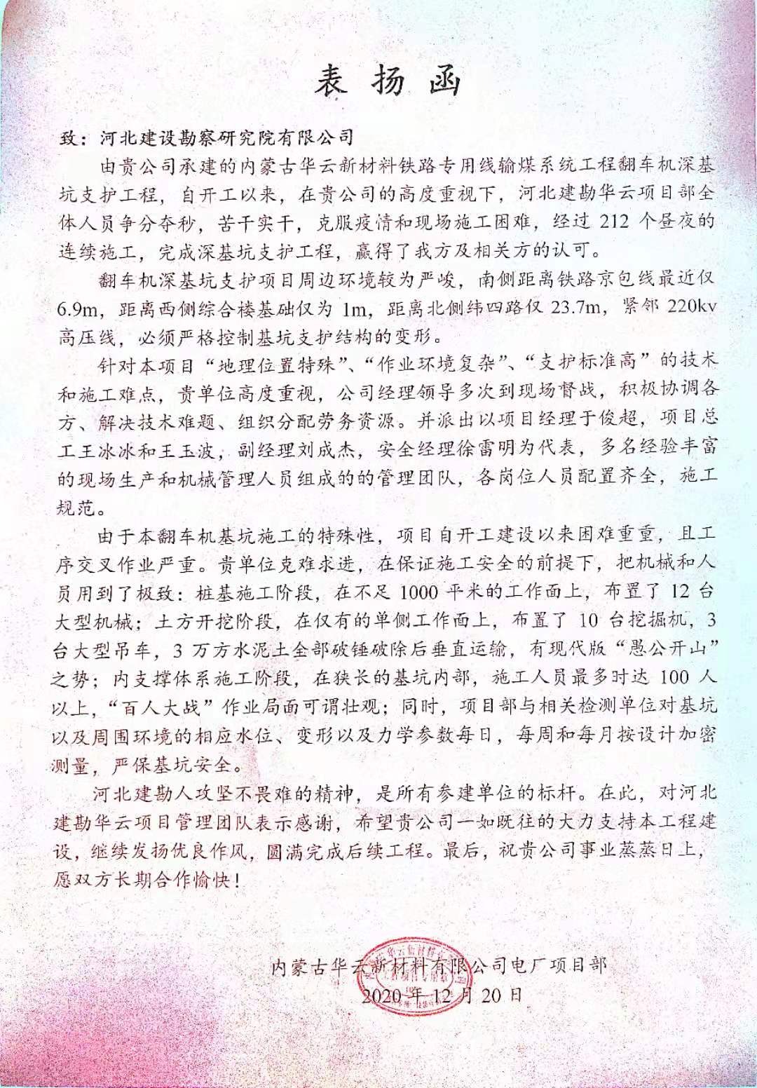在表?yè)P(yáng)信中,對(duì)于我們河北建勘人攻堅(jiān)不畏難的精神予以了充分肯定和高度評(píng)價(jià),被認(rèn)為是所有參建單位的標(biāo)桿,并希望我公司繼續(xù)發(fā)揚(yáng)優(yōu)良作風(fēng),圓滿(mǎn)完成后續(xù)工程,愿雙方長(zhǎng)期合作。
