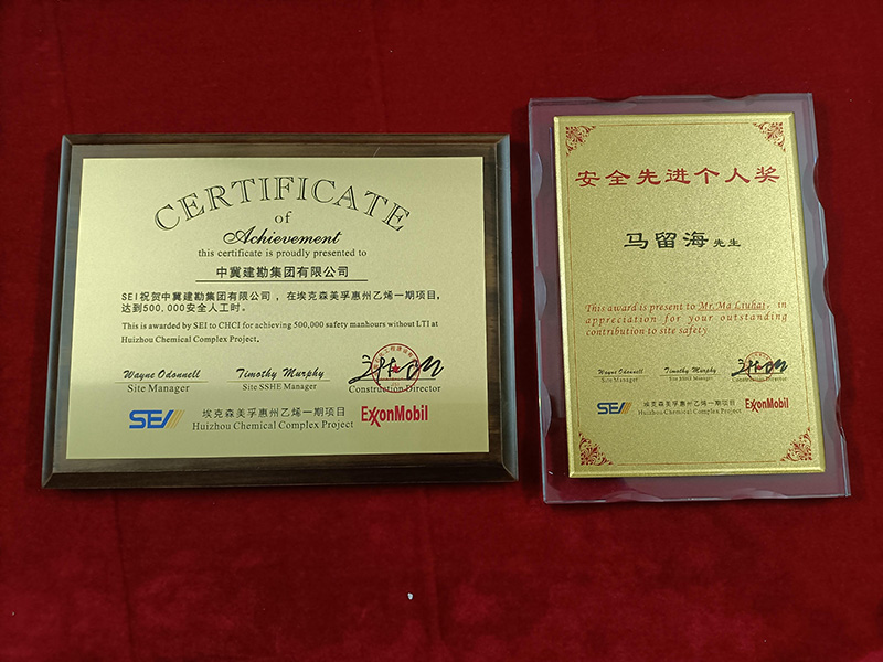 近日,我公司承建的埃克森美孚惠州乙烯一期項目強(qiáng)夯工程,榮獲“達(dá)到500000安全人工時”優(yōu)秀團(tuán)隊獎,馬留海榮獲 “安全先進(jìn)個人獎”。