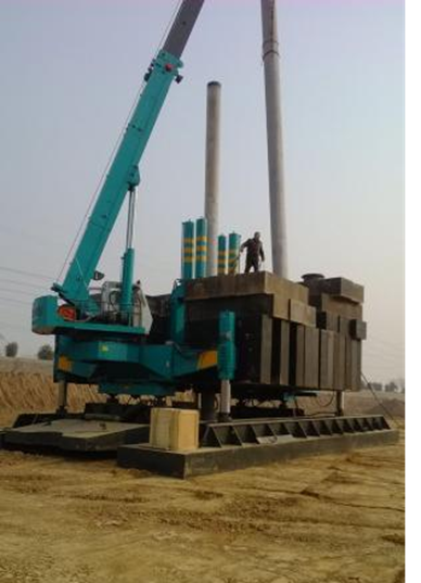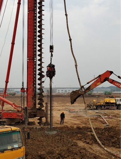 本工程2#、3#廠房樁基成孔采用長(zhǎng)螺旋后插筋工藝,混凝土壓灌完成后,進(jìn)行鋼筋籠安放工作,鋼筋籠安放采用25T吊車(chē)和振桿、震動(dòng)器(采用閉合式鏈接)配合進(jìn)行。鋼筋籠下入孔中后,保證在孔內(nèi)居中,先由鋼筋籠量與振錘自身的重量讓鋼筋籠自行下沉,當(dāng)不能自行下沉?xí)r(約達(dá)到3/1-3/2籠長(zhǎng)時(shí)),立即開(kāi)動(dòng)震錘,邊振動(dòng)混凝時(shí)鋼筋籠邊隨著下沉,鋼筋籠隨著振動(dòng)下沉至到樁頂標(biāo)高位置后,采用雙吊筋固定鋼筋籠位置,緩慢將導(dǎo)管從樁身中拔出,并開(kāi)動(dòng)震錘,即完成了該樁的施工。當(dāng)遇見(jiàn)孔口下沉現(xiàn)象時(shí),先用人工清理出表面混凝土,再由鉆機(jī)開(kāi)至孔口進(jìn)行補(bǔ)方。