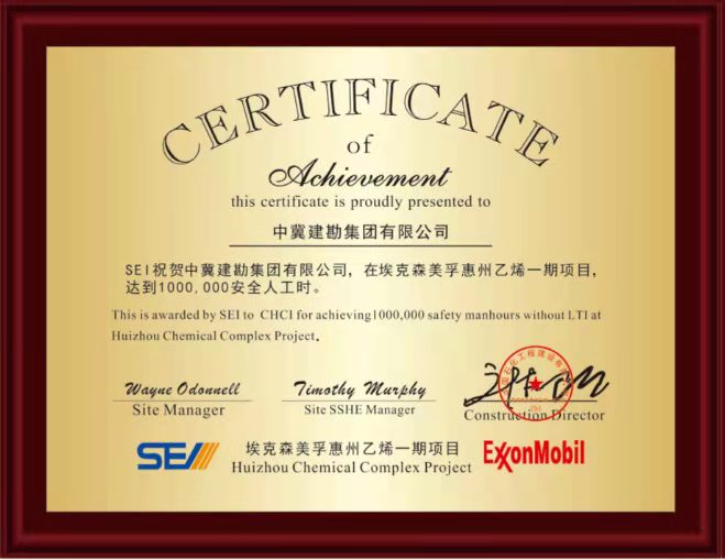 廣東惠州埃克森美孚惠州乙烯一期項目樁基工程,榮獲埃克森美孚(惠州)化工有限公司及中國石化工程建設有限公司惠州項目部“達到1000000安全人工時”優秀團隊獎,耿蕩榮獲“安全先進個人獎”。