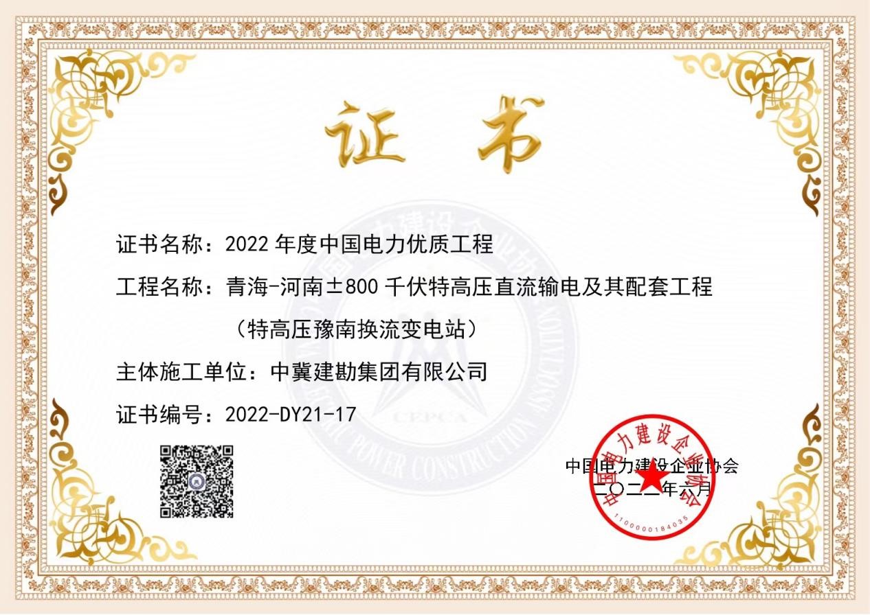 豫南換流站項目榮獲2022年度中國電力行業(yè)優(yōu)質(zhì)工程獎