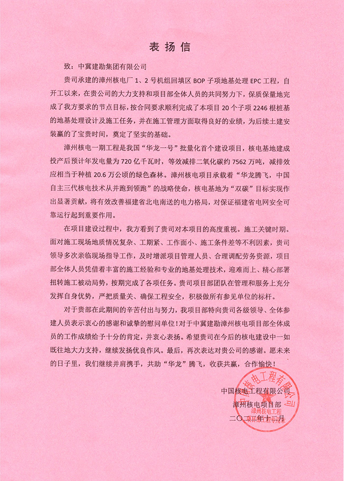 漳州核電一期工程是我國“華龍一號”批量化首個建設項目,承載著“華龍騰飛,中國自主三代核電技術從并跑到領跑”的戰略使命,核電基地為“雙碳”目標實現作出顯著貢獻,是國家核電建設的重點項目。在工程建設過程中面對規模較大、場地分散、交叉施工等多項不利因素,項目部迎難而上、精心部署、晝夜施工,確保安全、質量的情況下按期完成了各項任務。項目部在谷習光同志的帶領下,在管理和服務上充分發揮自身優勢,積極爭當所有參見單位的標桿,得到了甲方和監理的高度贊揚,為以后更多的合作奠定了堅實基礎。
