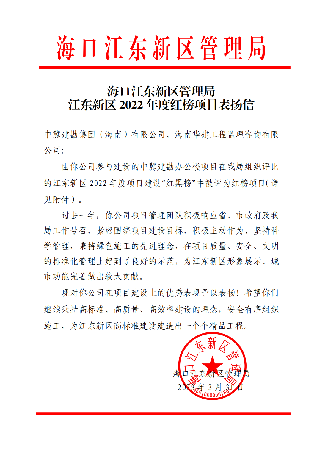 人勤春來早,實(shí)干正當(dāng)時(shí)。2023年3月31日,為促進(jìn)項(xiàng)目建設(shè)進(jìn)度,營(yíng)造“安全、文明、有序”的建設(shè)氛圍,??诮瓥|新區(qū)管理局公布了2022年度項(xiàng)目建設(shè)“紅黑榜”,“中冀建勘辦公樓”項(xiàng)目再次受到表彰,并為項(xiàng)目頒發(fā)了榮譽(yù)證書。