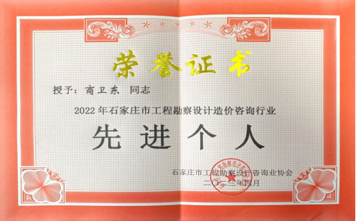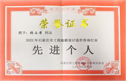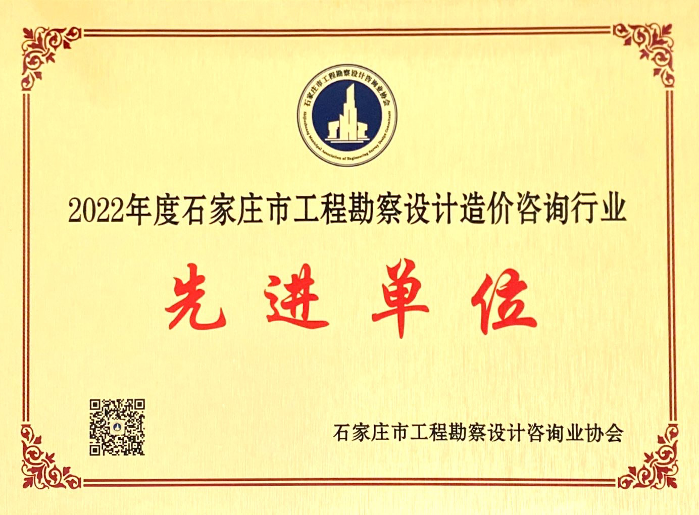 近日,石家莊市工程勘察設計咨詢業協會下發《關于表彰2022年石家莊市工程勘察設計造價咨詢行業先進單位和先進個人的通知》(石設協字【2023】2號),我公司被授予“2022年石家莊市工程勘察設計造價咨詢行業先進單位”稱號,韓立君同志、商衛東同志被授予“2022年石家莊市工程勘察設計造價咨詢行業先進個人”稱號。