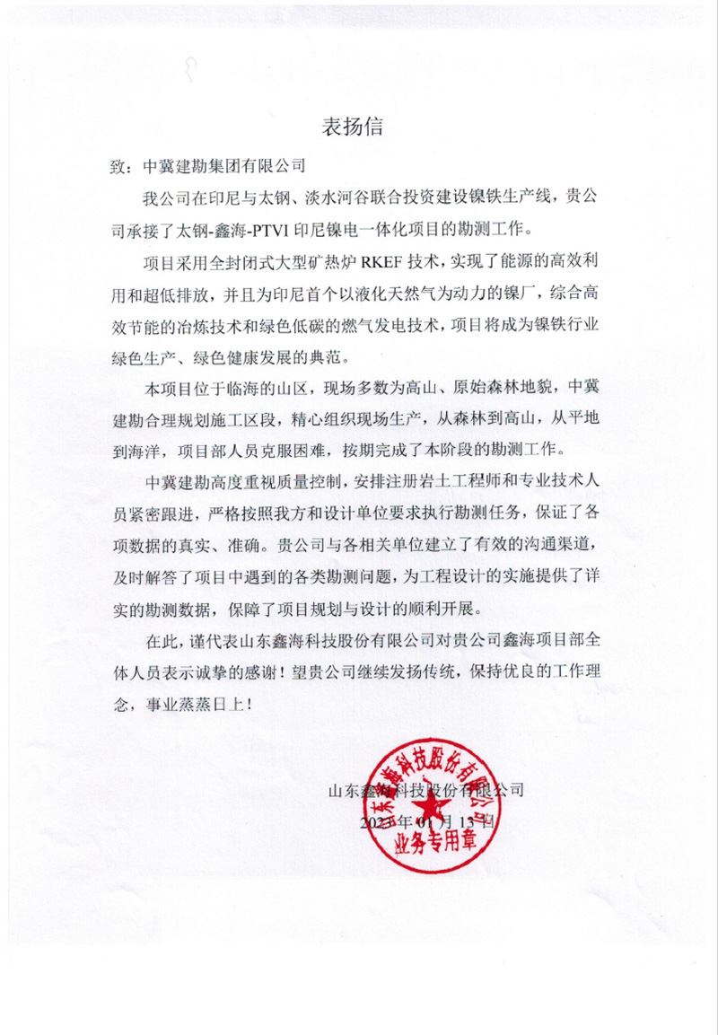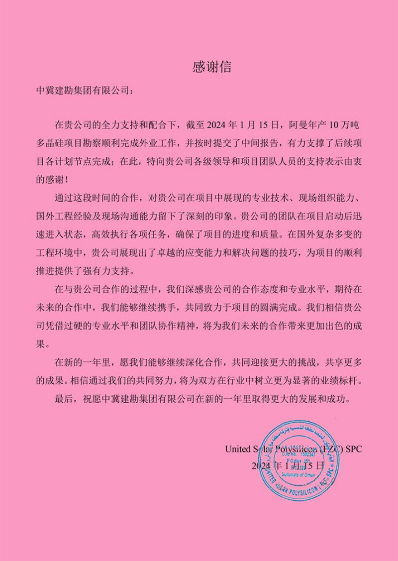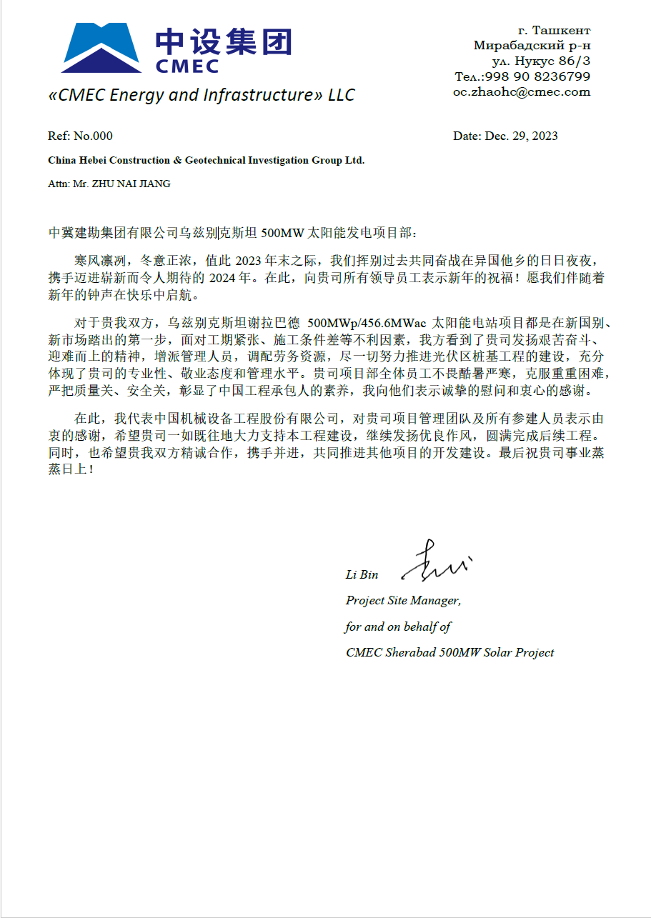 中國機(jī)械設(shè)備工程股份有限公司發(fā)來的表揚(yáng)信,對在烏茲別克斯坦謝拉巴德 500MWp/456.6MWac 太陽能電站項(xiàng)目建設(shè)過程中,項(xiàng)目全體人員克服諸多不利因素,發(fā)揚(yáng)建勘精神,盡一切努力推進(jìn)工程建設(shè),以及公司的專業(yè)性、敬業(yè)態(tài)度和管理水平給予了高度評價(jià)。同時(shí),對項(xiàng)目管理團(tuán)隊(duì)及所有參建人員表示由衷的感謝,并希望雙方精誠合作,攜手并進(jìn),共同推進(jìn)其他項(xiàng)目的開發(fā)建設(shè)。