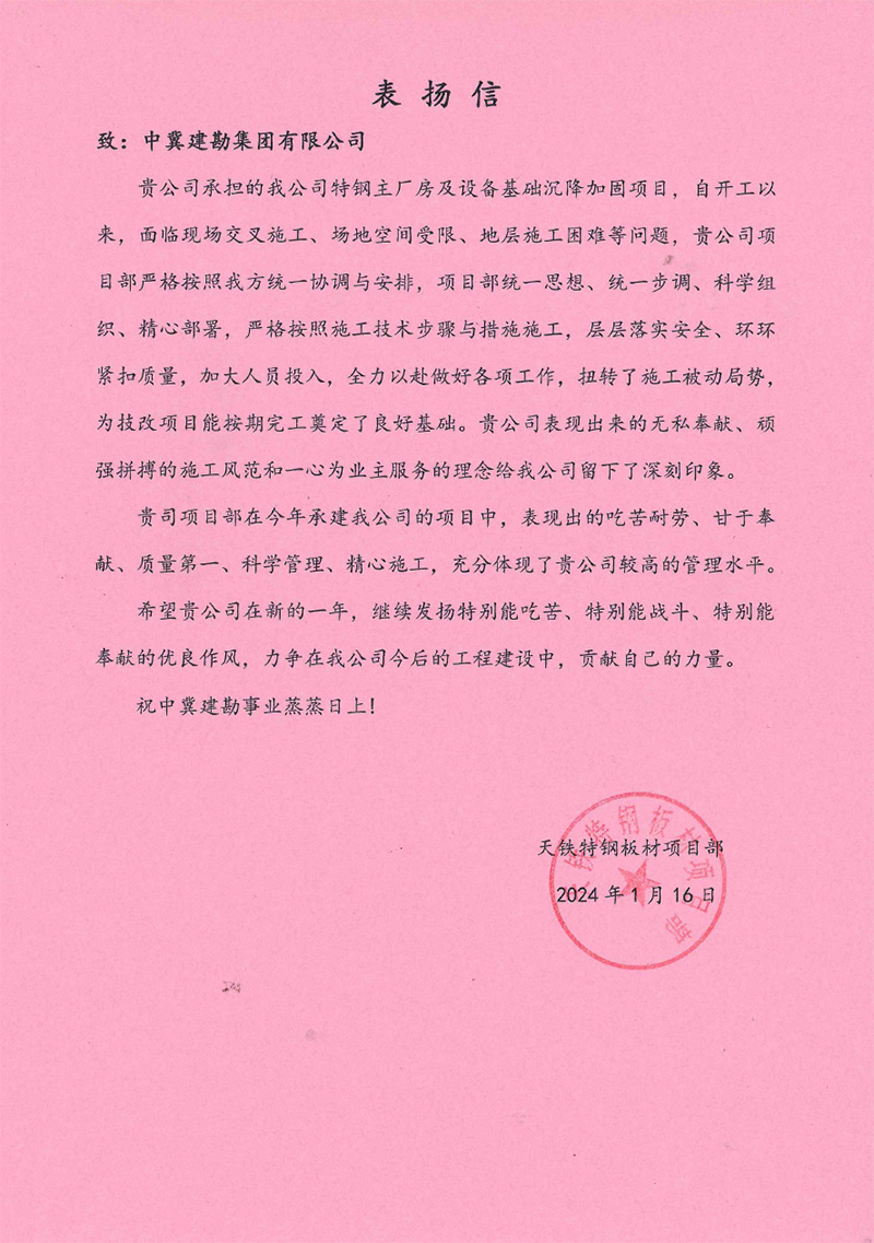 近日,集團(tuán)公司陸續(xù)收到國內(nèi)外項(xiàng)目業(yè)主發(fā)來的表揚(yáng)信,信中對我公司的項(xiàng)目管理、團(tuán)隊(duì)建設(shè)、安全文明施工、技術(shù)質(zhì)量管控等,給予了高度評價(jià),同時(shí)送上了新年一年的祝福。