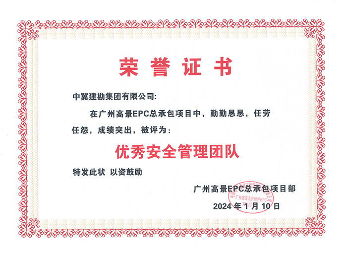 中國電子系統(tǒng)工程第四建設(shè)有限公司發(fā)來的表揚(yáng)信,對我公司在廣州高景太陽能科技有限公司高效光伏組件項(xiàng)目建設(shè)過程中,公司的大力配合和項(xiàng)目部全體人員的共同努力下,安全管理體系覆蓋到位,質(zhì)量保證措施到位,嚴(yán)格把控質(zhì)量、安全關(guān),出色完成了施工任務(wù),特向我公司各級領(lǐng)導(dǎo)、全體參建員工表示衷心的感謝,并授予“優(yōu)秀安全管理團(tuán)隊(duì)”和“優(yōu)秀資料包商”榮譽(yù)。