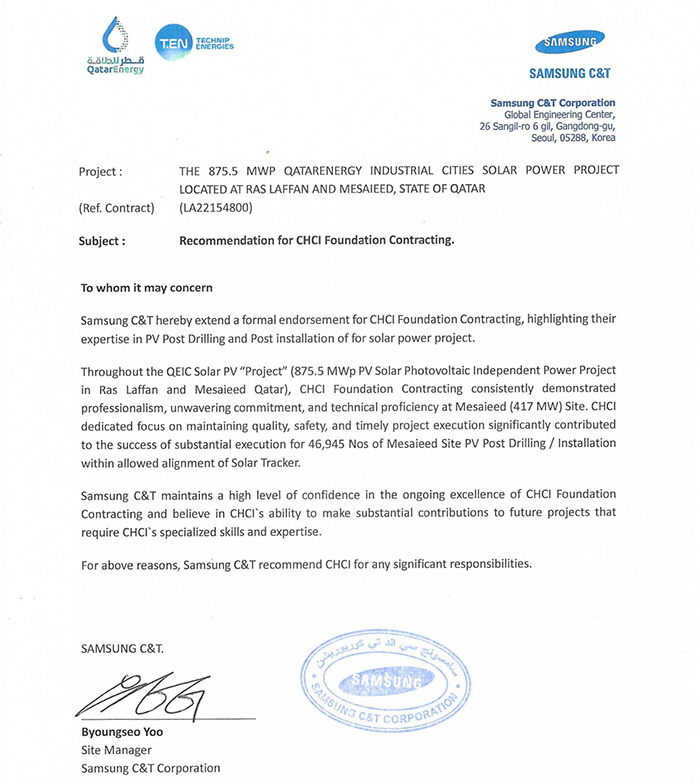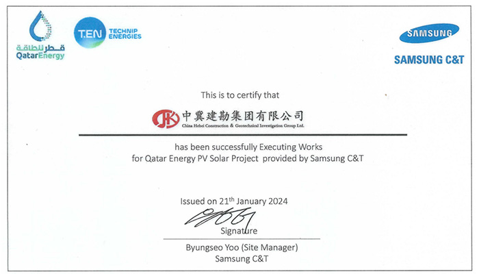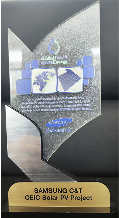 我公司收到卡塔爾能源875.5MW光伏發電項目業主方卡塔爾能源和總包方三星C&T公司聯合頒發的獎杯和推薦信。業主及總包方高度認可我公司項目履約能力,贊揚我司對該項目成功交付做出重大貢獻,表示愿意與我司建立長期合作關系?;谖宜咀吭降穆募s表現,三星C&T公司授予我司推薦信。