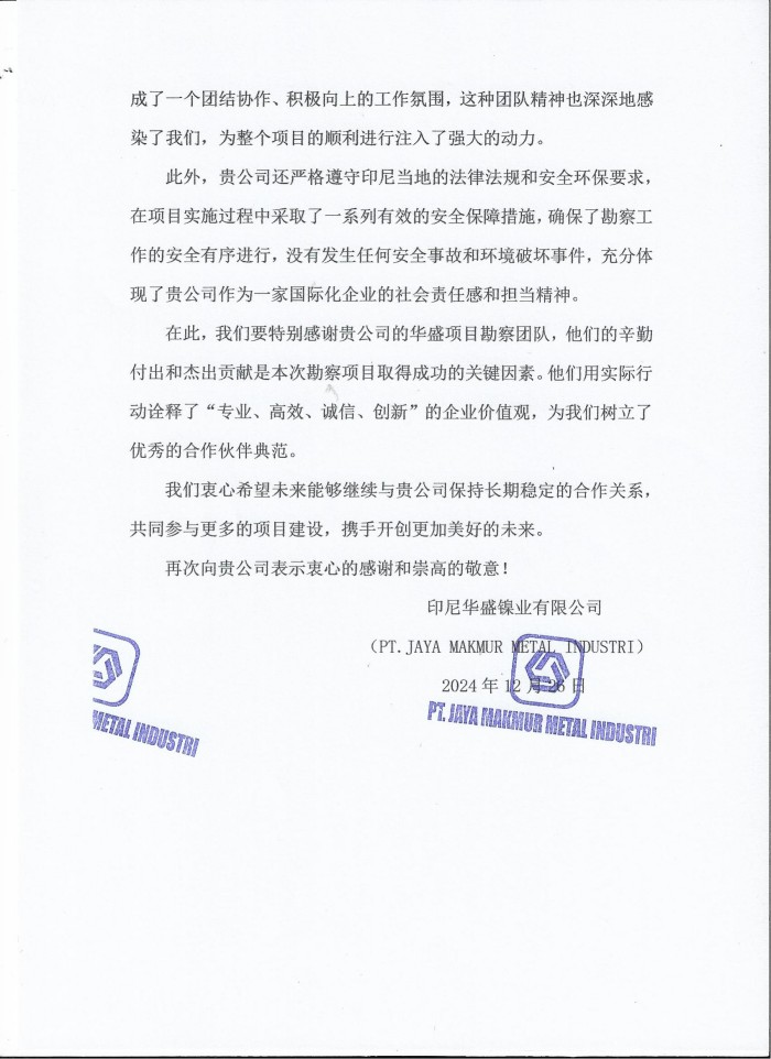 印尼華盛鎳業有限公司發來了表揚信。在印尼華盛鎳業有限公司一期冶煉廠、電廠地質勘察項目及印尼華盛-年產200萬噸綜合鋼鐵項目的勘察任務中,印尼華盛勘察項目部全體職工迅速適應印尼當地的復雜環境和炎熱的氣候條件,克服了語言溝通、文化差異以及交通不便等諸多困難,全身心地投入到工作中。在項目實施過程中,嚴格遵守印尼當地的法律法規和安全環保要求,采取了一系列有效的安全保障措施,確保了勘察工作的安全有序進行。這種高度的專業素養和社會責任感,贏得了業主方的高度贊揚和深深感激。