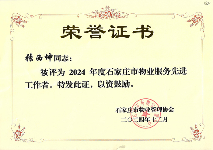 中冀建勘物業服務有限公司榮獲“2024年度石家莊市物業管理先進單位”,張西坤同志榮獲“物業服務先進工作者” 榮譽稱號。