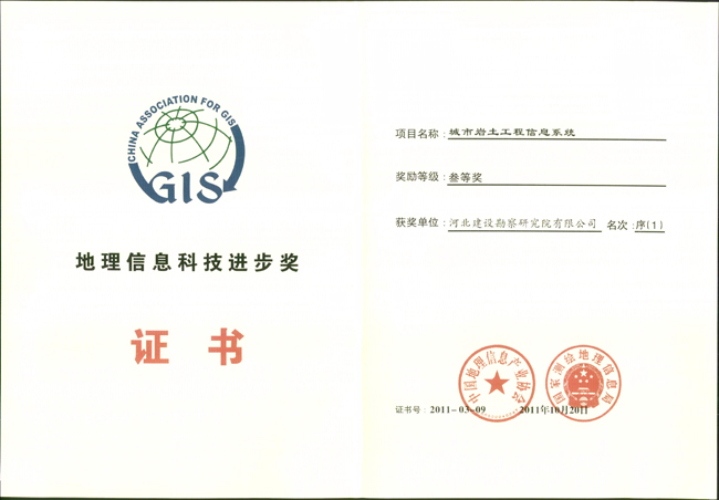 2011年10月25日,2011年度中國地理信息科技進步獎頒獎儀式在北京國際會議中心隆重舉行,經中國地理信息產業協會、國家測繪地理信息局評選,我公司完成的項目《城市巖土工程信息系統》榮獲2011年度地理信息科技進步三等獎。